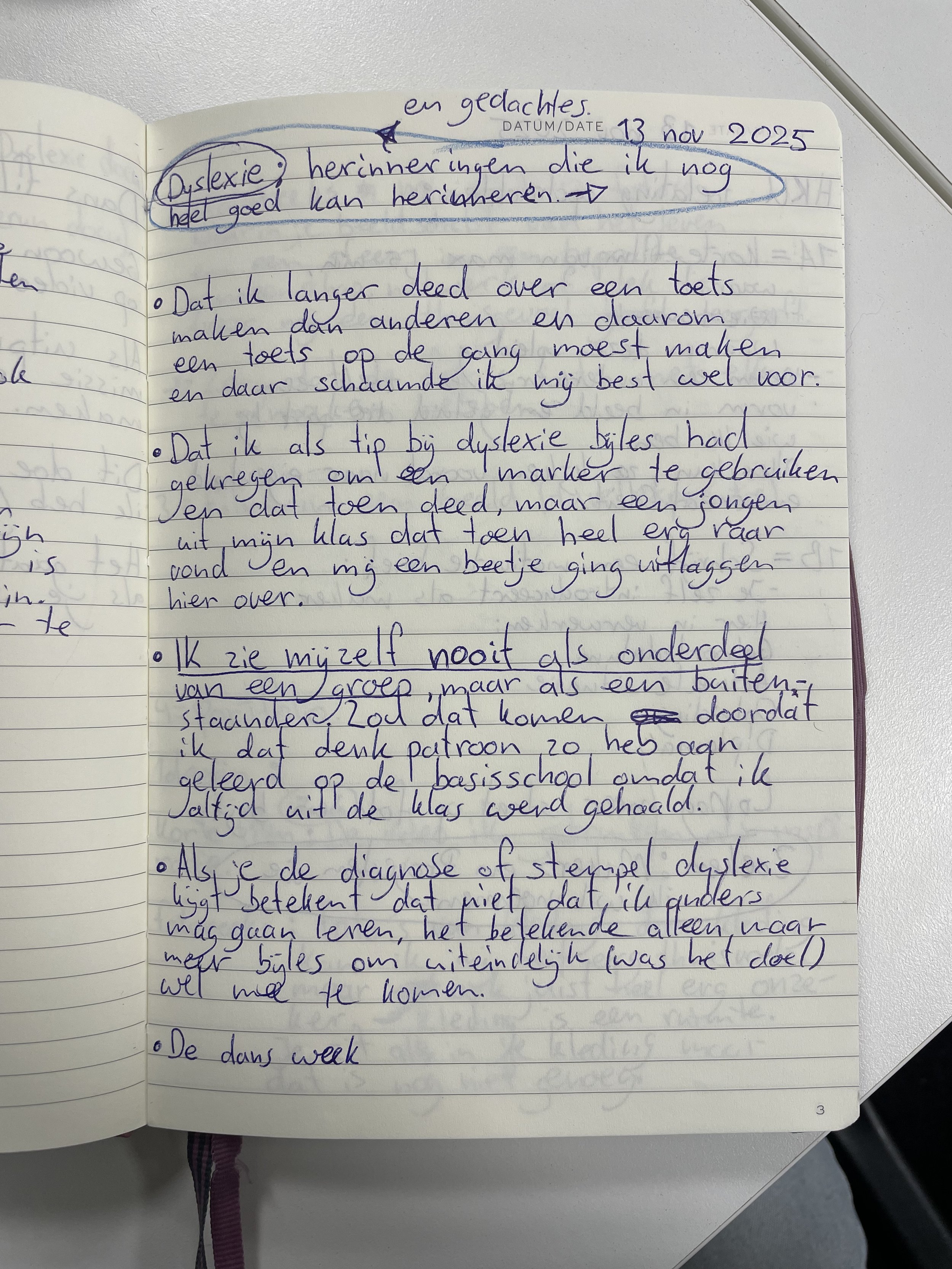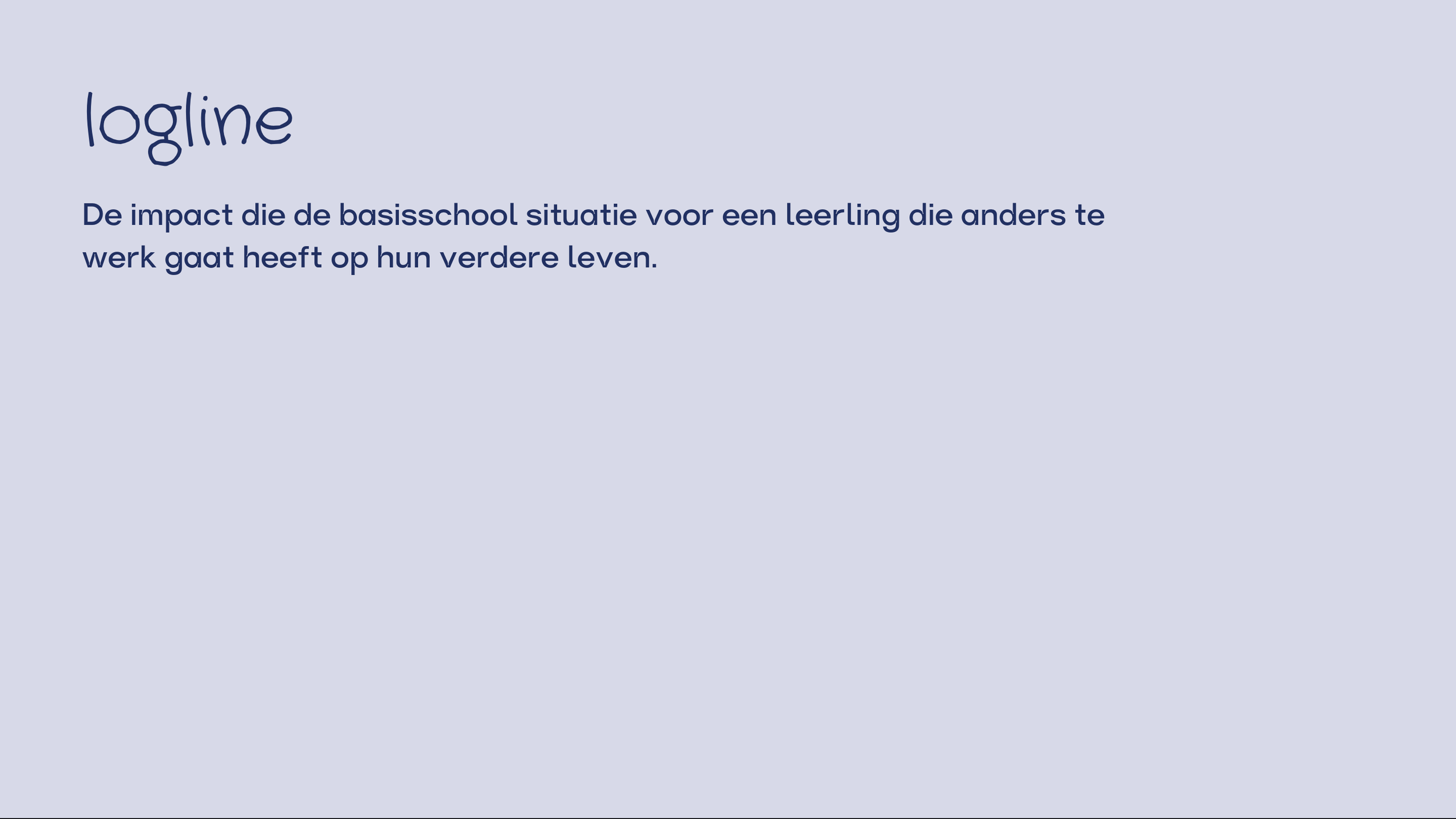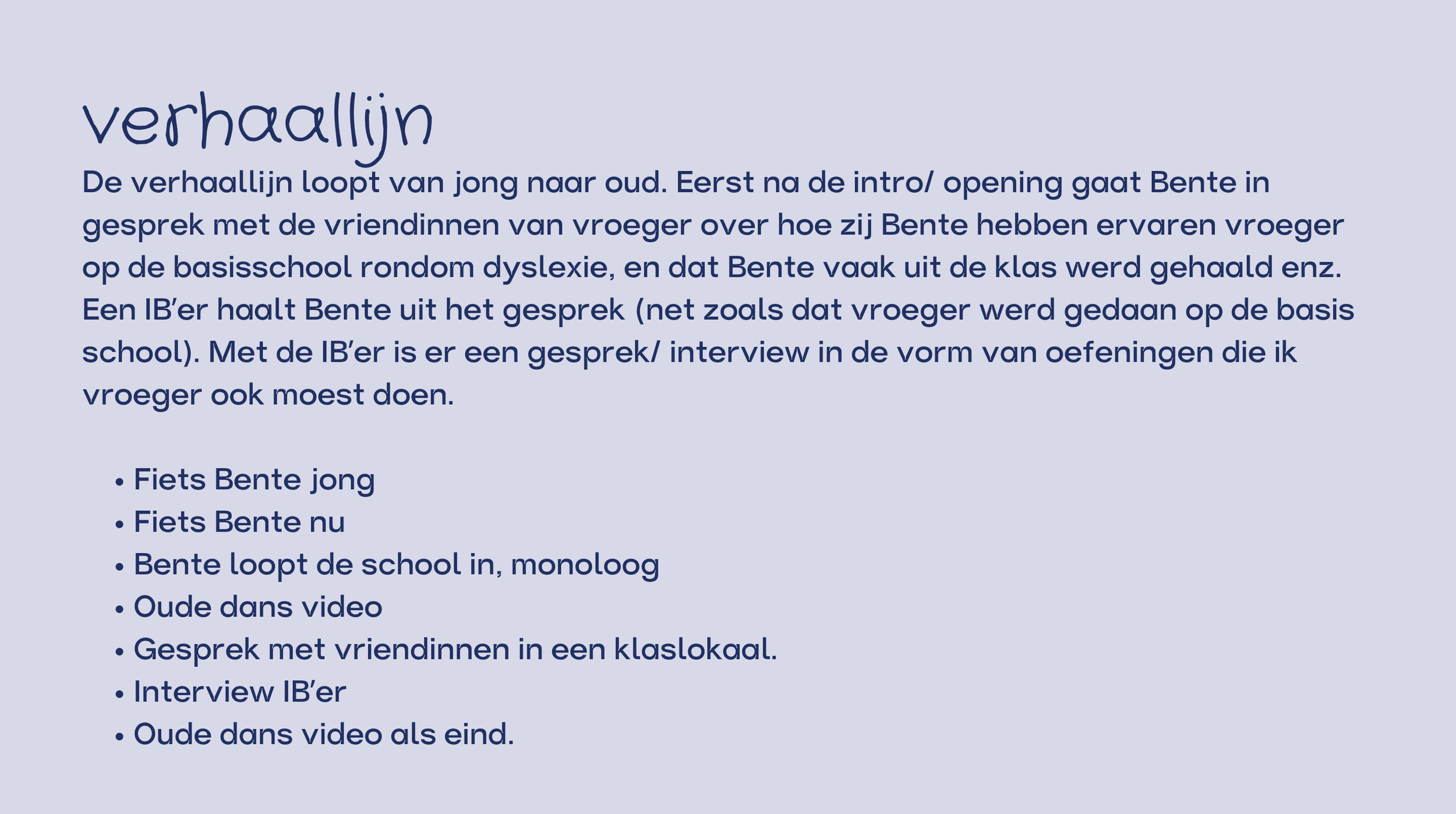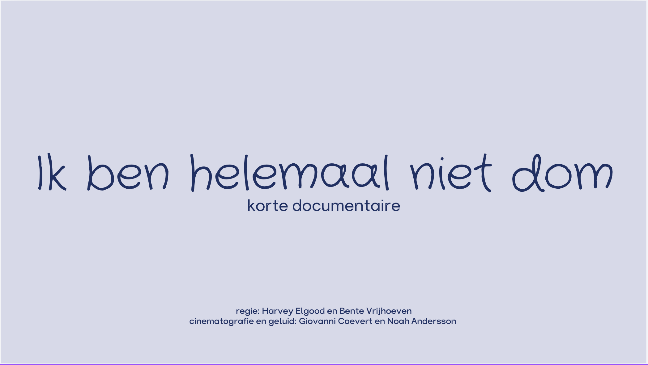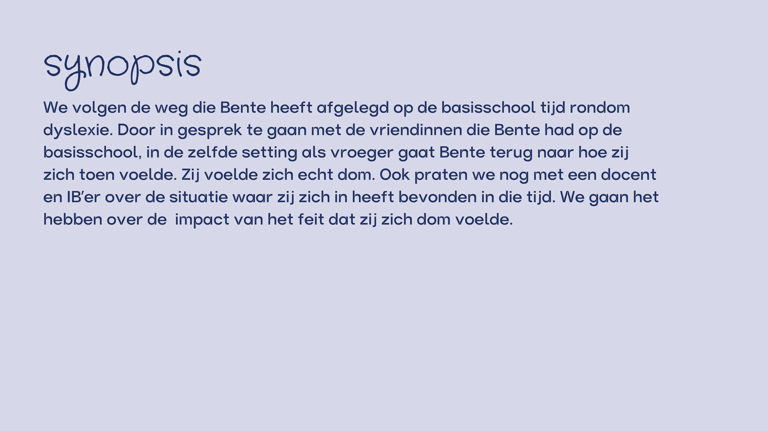 (Opdracht ‘ideeën pitchen’ Open Studio) Deze documentaire, waarvoor ik het idee had gepitcht, hebben we gemaakt om onderzoek te doen naar het onderwerp dyslexie en andere neurodiversiteit op de basisschool. En wat dat betekend voor een kind. Wij hadden alleen een te groots idee om te kunnen uitvoeren in de tijd die we hadden. Dus hebben we het onderzoek verpakt in een documentaire. Voor dit onderzoek hebben we mijn ervaring op de basisschool als invalshoek gebruikt. Ik heb namelijk dyslexie en heb mijn vragen bij hoe mijn leeraren en basisschool daar mee zijn om gegaan. Deze documentaire is een begin.